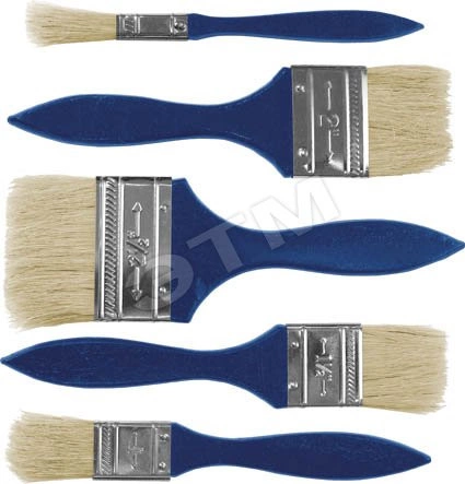 Для работы со всеми видами лакокрасочных материалов. Натуральная светлая щетина, деревянная ручка (3 шт. 1', 1,5', 2'), (5 шт. 1/2', 1', 1,5', 2', 2,5').