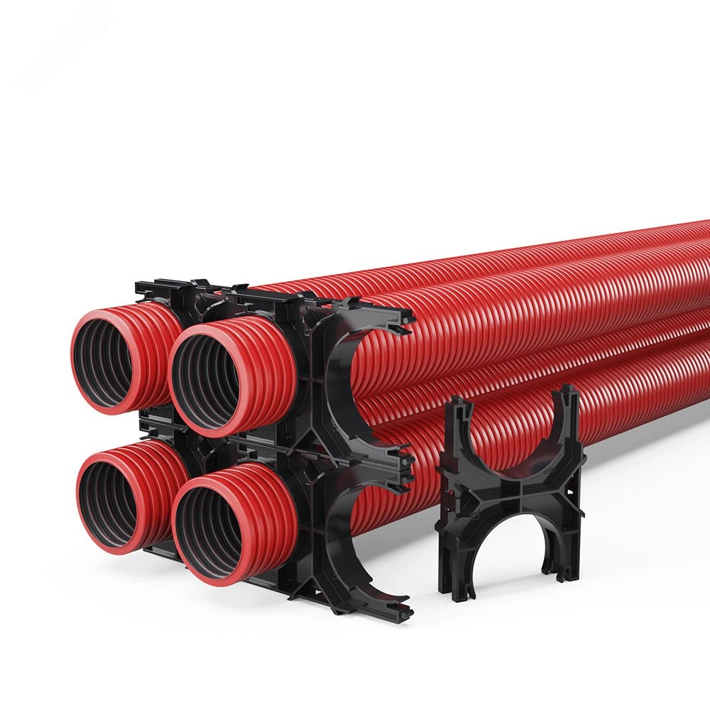 Кластеры предназначены для упорядоченной прокладки двустенных гофрированных труб с фиксированным расстоянием между трубами. При необходимости групповой прокладки Кластеры одного типоразмера соединяются между собой по горизонтали и вертикали.