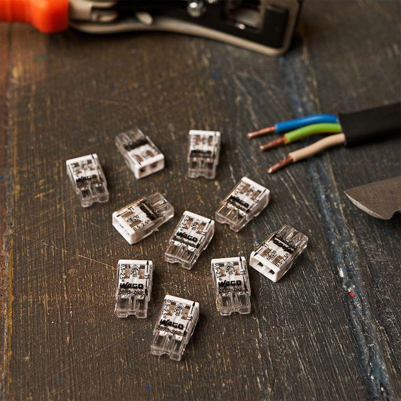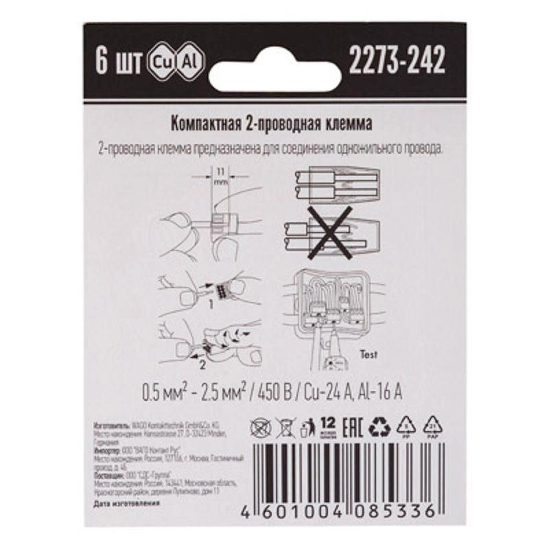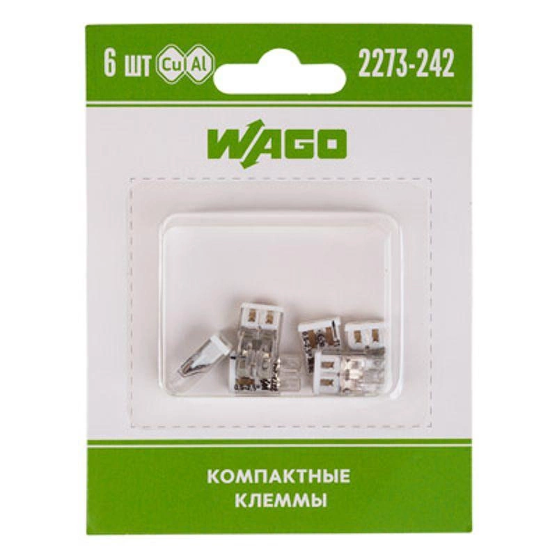 Элетромонтажные экспресс-клемы WAGO 2273-242 позволят безопасно и быстро соединить 2 провода между собой (алюминиевые и медные как одножильные, так и многожильные). Достаточно просто вставить жилу кабеля или провода в клемму и самозажимной контакт надежно зафиксирует соединение. Диаметр соединяемых проводов должен составлять в сечении от 0,5 до 2,5 кв.мм. Номинальный ток 24А; Номинальное напряжение 450В. Удобные тестовые гнезда, прозрачный корпус для визуального контроля и смотровое окно для проверки защиты от касаний делают работу более безопасной. Наличие пасты обеспечивает надёжную изоляцию контакта