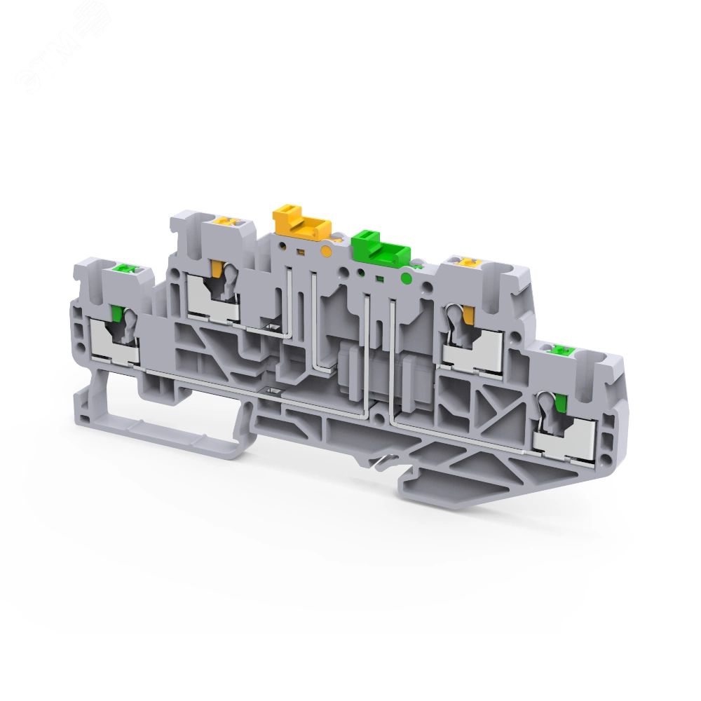 Двухъярусная клемма типа push-in на номинальное сечение проводника 2,5 кв. мм. с возможностью разъединения контактов каждого яруса. Предназначена для установки в распределительных шкафах и щитах систем автоматического управления (САУ) с монтажом на DIN-рейку шириной 35 мм. Ярусы клеммы не соединены перемычкой. Клемма позволяет легко присоединить круглые медные проводники, номинальным сечением от 0,2 до 2,5 кв.мм, обеспечивая надежный контакт и скорость сборки электрических схем. Особенностью данного типа клемм является возможность подключения до четырех проводников в одной клемме, обеспечивая большую плотность подключений и компактность решения, а также наличие двух ножевых разъединителей - по одному для каждого яруса клеммы.