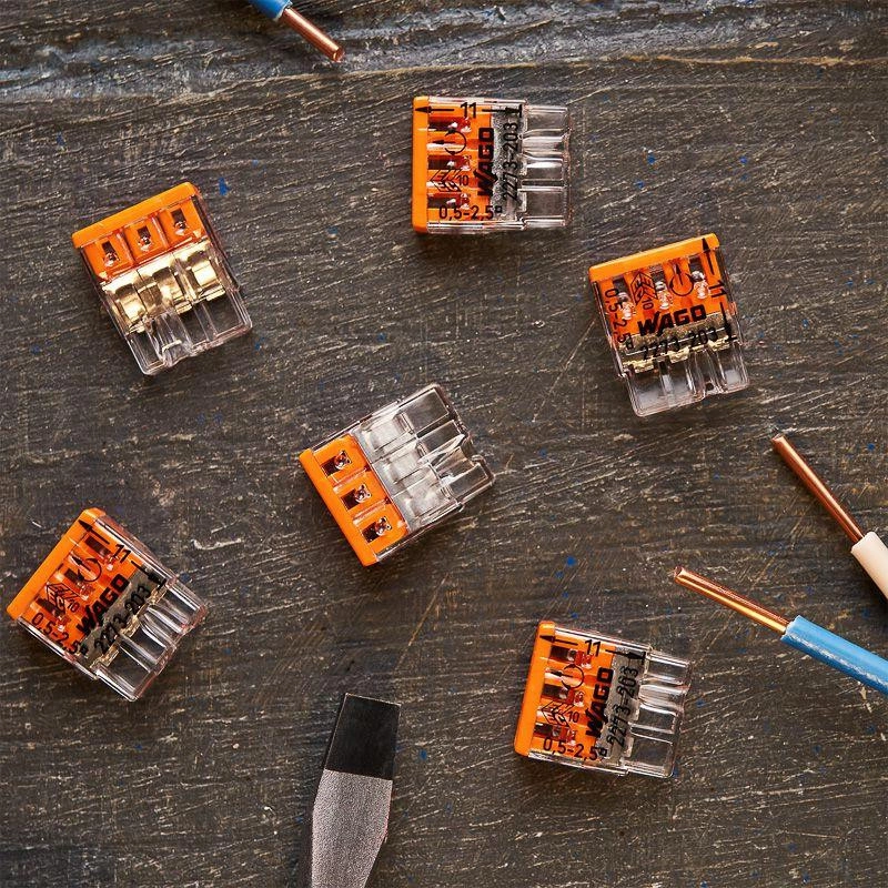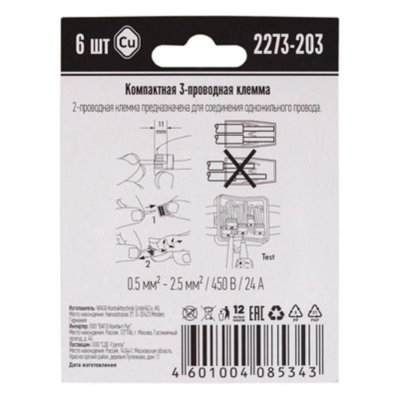 Электромонтажные экспресс-клемы WAGO 2273-203 позволят безопасно и быстро соединить 3 провода между собой (алюминиевые и медные как одножильные, так и многожильные). Достаточно просто вставить жилу кабеля или провода в клемму и самозажимной контакт надежно зафиксирует соединение. Диаметр соединяемых проводов должен составлять в сечении от 0,5 до 2,5 кв.мм. Номинальный ток 24А; Номинальное напряжение 450В. Удобные тестовые гнезда, прозрачный корпус для визуального контроля и смотровое окно для проверки защиты от касаний делают работу более безопасной.
