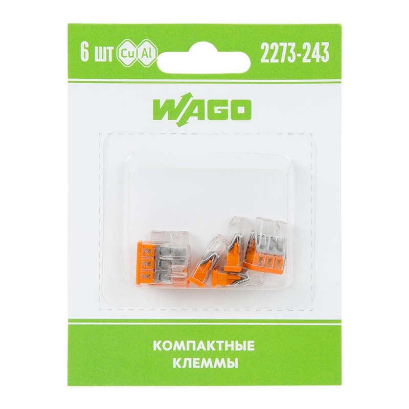 Электромонтажные экспресс-клемы WAGO 2273-243 позволят безопасно и быстро соединить 3 провода между собой (алюминиевые и медные как одножильные, так и многожильные). Достаточно просто вставить жилу кабеля или провода в клемму и самозажимной контакт надежно зафиксирует соединение. Диаметр соединяемых проводов должен составлять в сечении от 0,5 до 2,5 кв.мм. Номинальный ток 24А; Номинальное напряжение 450В. Удобные тестовые гнезда, прозрачный корпус для визуального контроля и смотровое окно для проверки защиты от касаний делают работу более безопасной. Наличие пасты обеспечивает надёжную изоляцию контакта