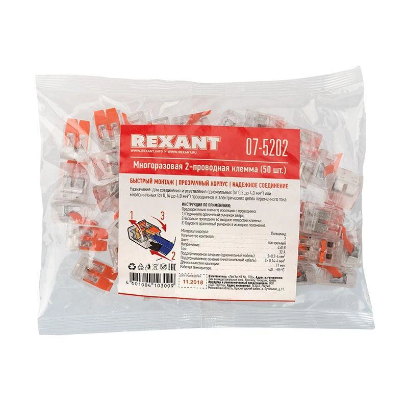 Клемма компактная многоразовая 2-проводная 0.14-4.0 кв.мм (уп.50шт) Rexant 07-5202
