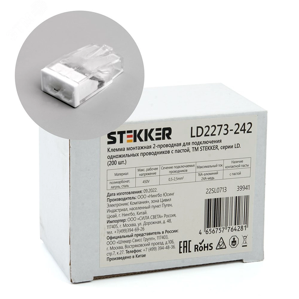 "Клемма пружинная компактная STEKKER LD2273-242 С ПАСТОЙ , 2-проводная для ОДНОЖИЛЬНОГО проводника 0,5-2,5 мм2, 450В, 24A, материал изделия поликарбонат, латунь, сталь. Паста служит для предотвращения окисления алюминиевых проводов. Тип подключаемого провода - одножильный, материал провода медь или алюминий, температура окружающей среды -20...+40°C. Имеет следующие преимущества - компактные размеры, позволяющие легко спрятать клемму в распределительной коробке