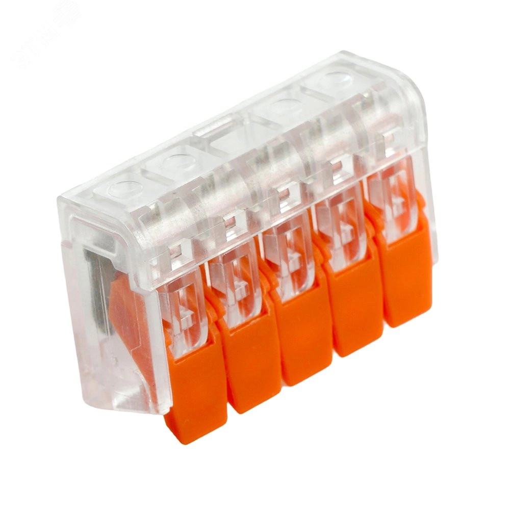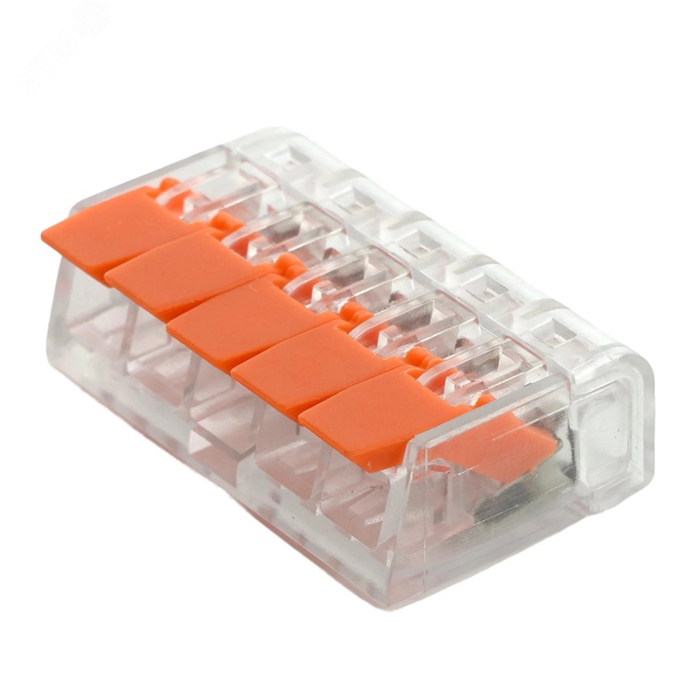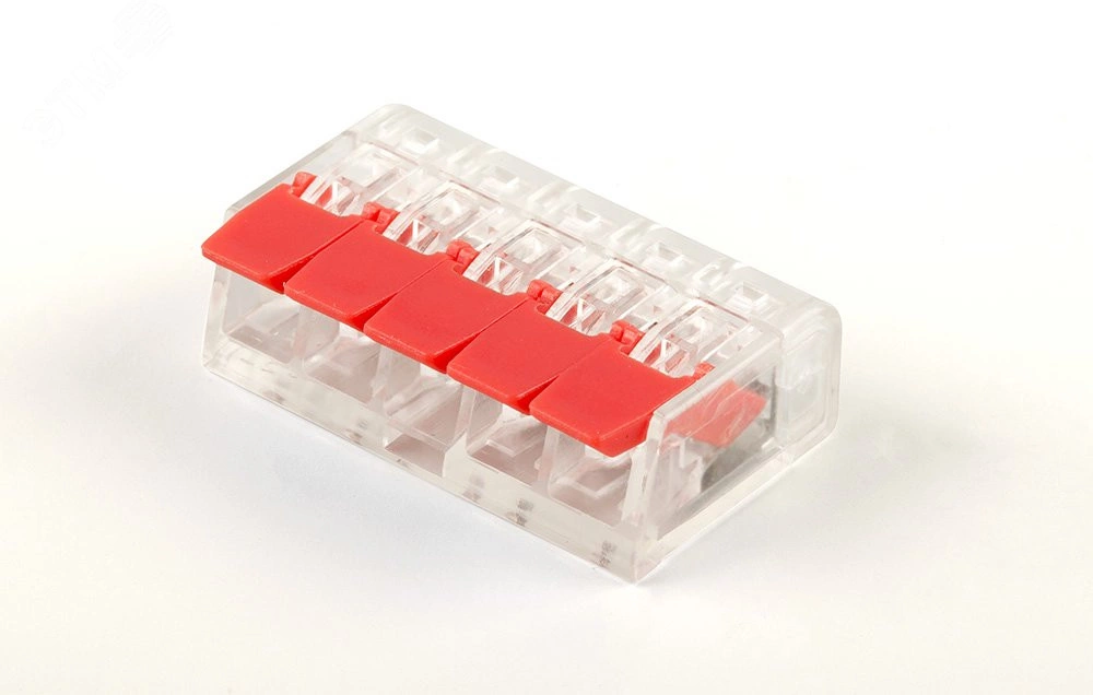 Клемма пружинная универсальная компактная STEKKER LD221-415, 5-проводная (сечение одножильного/многожильного проводников) 0,14 - 4мм2, 450В, максимальный ток 32А, без пасты, материал изделия поликарбонат, латунь. Тип провода одножильный/многожильный, материал присоединяемого проводника - медь, температура окружающей среды -20 - +40 градусов C. Клеммы серии 221 удобны тем, что конструкция позволяет визуально проверить контакт без лишних трудностей, т.к. зажимы имеют прозрачный корпус.