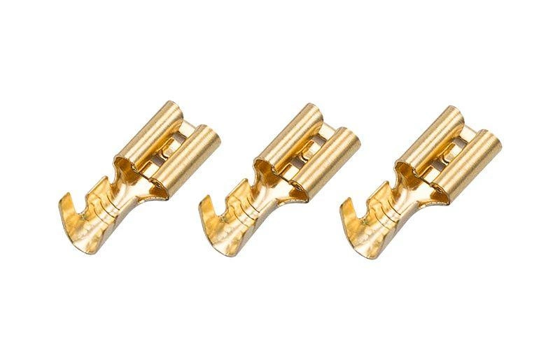 Клемма плоская неизолированная (гнездо) REхANT изготовлена из латуни. Обжатие производится специальными пресс-клещами (ht-202; ht-230; ht-301) по жиле и по изоляции, что обеспечит максимальную прочность соединения с проводом. Каждая клемма имеет фиксатор для более прочного механического соединения с штекерным разъемом.