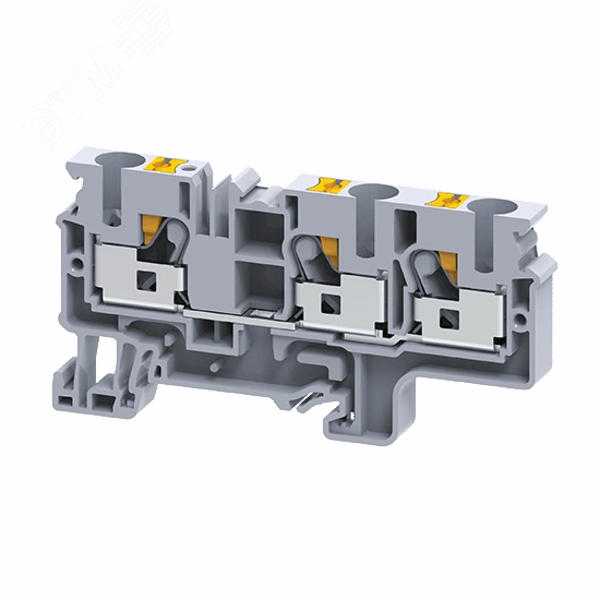 Клемма проходная типа push-in с тремя выводами на номинальное сечение проводника 10 кв. мм. Предназначена для установки в распределительных шкафах и щитах систем автоматического управления (САУ) с монтажом на DIN-рейки. Клеммы позволяют легко присоединить круглые медные проводники, номинальным сечением 10 кв.мм, обеспечивая надежный контакт и простоту сборки электрических схем. Особенностью данного типа клемм является возможность подключения трёх проводников в одной клемме, обеспечивая большую плотность подключений и компактность решения. Все клеммные зажимы в одной клемме имеют электрическую связь. Клеммы применяются в электрических цепях на номинальное напряжение до 1000 В переменного тока.
