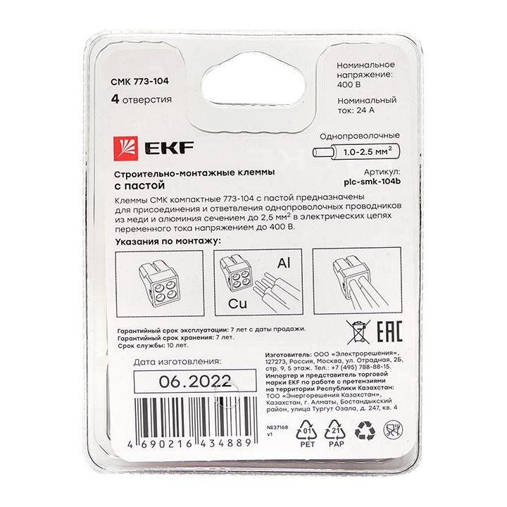 Полное описание: Клемма строительно-монтажная СМК 773-104 4 отверстия 1.0-2.5кв.мм (блист.5шт) PROxima EKF plc-smk-104b