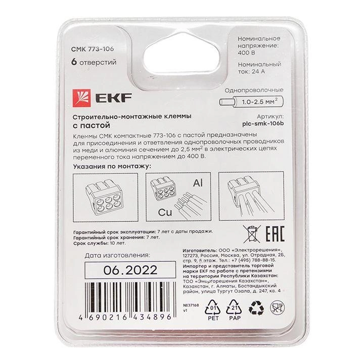 Полное описание: Клемма строительно-монтажная СМК 773-106 6 отверстий 1.0-2.5кв.мм (блист.5шт) PROxima EKF plc-smk-106b