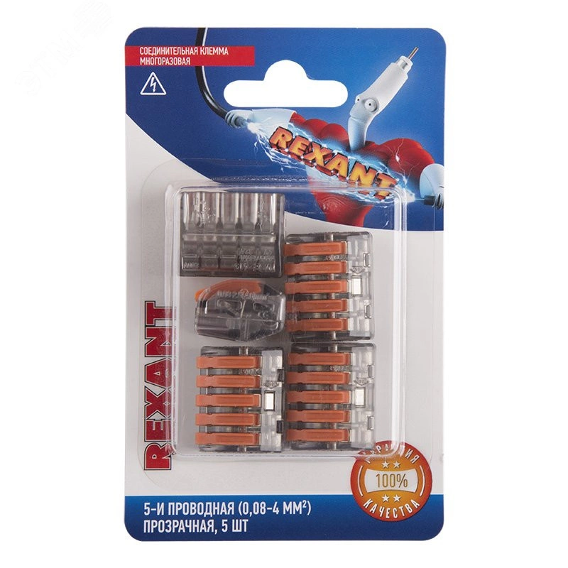 Соединительная многоразовая клемма на 5 проводника с плоско-пружинным зажимом предназначена для подсоединения медных одножильных и многожильных проводников тонкого сечения. Клемма изготовлена из полиамида 66, имеет 5 контактов, цвет корпуса прозрачный, напряжение 400 В. Ток для одножильных проводов - 32А, для многожильных проводов - 24А 28-12 AWG. Поддерживаемое сечение 0.08-4мм.кв. (одножильный провод), 0.08-2.5мм.кв. (многожильный провод).