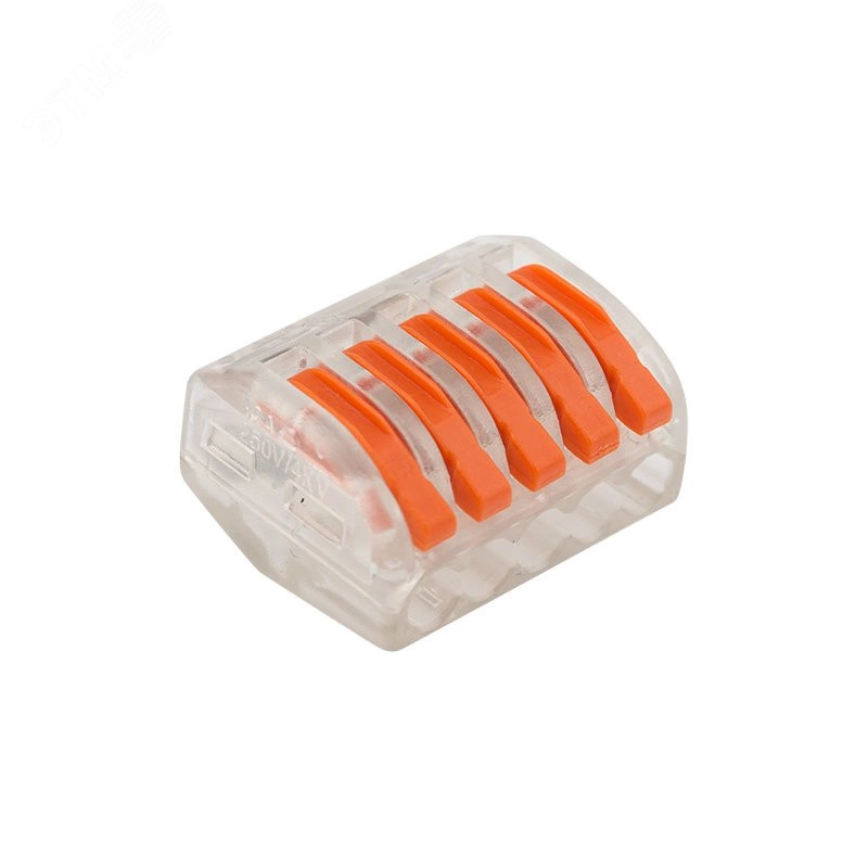 Соединительная многоразовая клемма REXANT на 5 проводников с плоско-пружинным зажимом предназначена для подсоединения медных одножильных и многожильных зачищенных проводников тонкого сечения. Перед монтажом с соединяемых проводников необходимо снять изоляцию в соответствии с обозначениями на корпусе клеммы (9-12 мм). Зачищенный участок с монтажной стороны не должен иметь сильных изгибов. Вставьте его в свободное гнездо клеммы, предварительно подняв оранжевый рычажок, после этого опустите рычажок в исходное положение. Контакт осуществляется путем зажима проводника пластиной. Конструкция предотвращает случайное размыкание контакта. Специальное технологическое отверстие на корпусе клеммы предназначено для проверки соединения тестером-пробником или щупом мультиметра. Извлечение проводника (демонтаж) осуществляется действиями в обратном порядке.