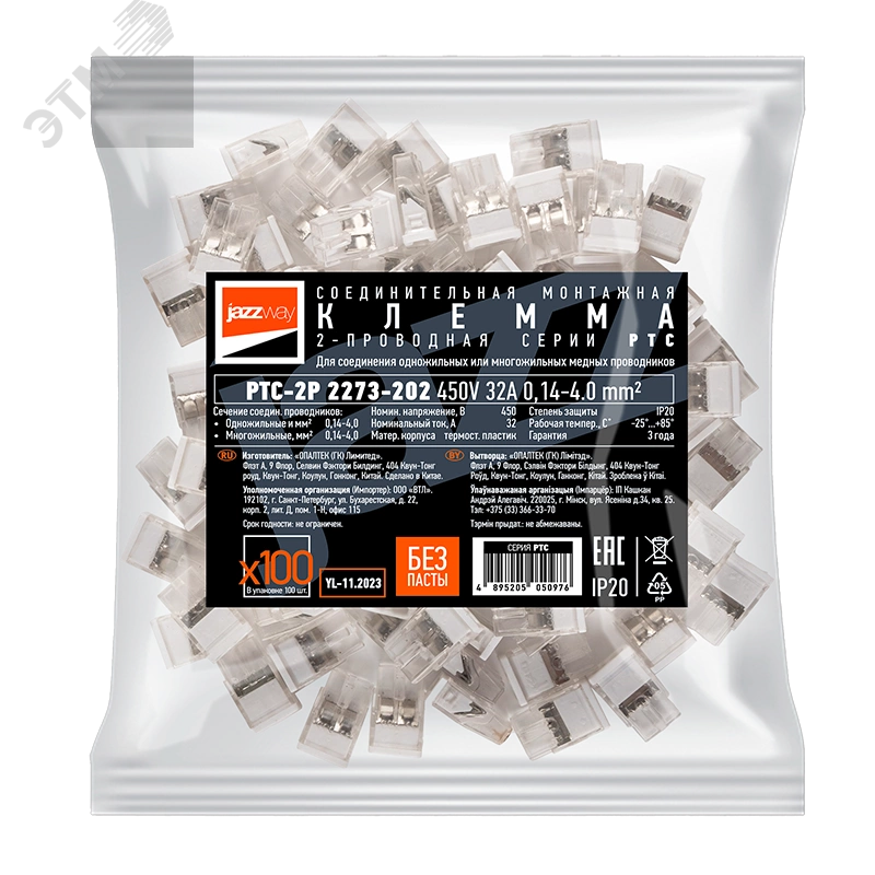 Клеммы монтажные PTC-2P 2273-202 450V 32A 0,14-4.0mm2 , 2 отверстия, прозрачные, 100 шт.