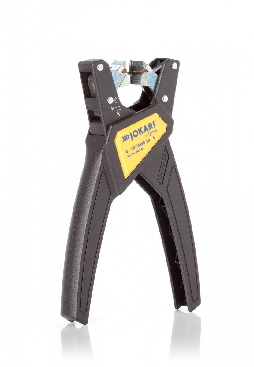 JOKARI - один из лидеров по производству инструмента для электромонтажных работ по снятию изоляции. Технологии подтвержденные множеством патентов позволяют изготавливать качественные стрипперы, ножи и автоматические съёмники изоляции. Инструменты фирмы JOKARI - 100% изготавливаются на собственных заводах в Германии как под своим именем, так и для многих других известных мировых брендов под их торговыми марками. Съемник изоляции автоматический предназначен для удаления изоляции с одножильных и многожильных круглых кабелей и проводников сечением от 6,0 до 16,0 мм2 Инструмент автоматически производит настройки под сечение проводника. Корпус изготовлен из полиамида, усиленного стеклопластиком. Небольшой вес и легкость хода позволяет работать продолжительное время без усталости. Нанесена разметка продольной подачи в диапазоне 15 – 18 – 20 мм.