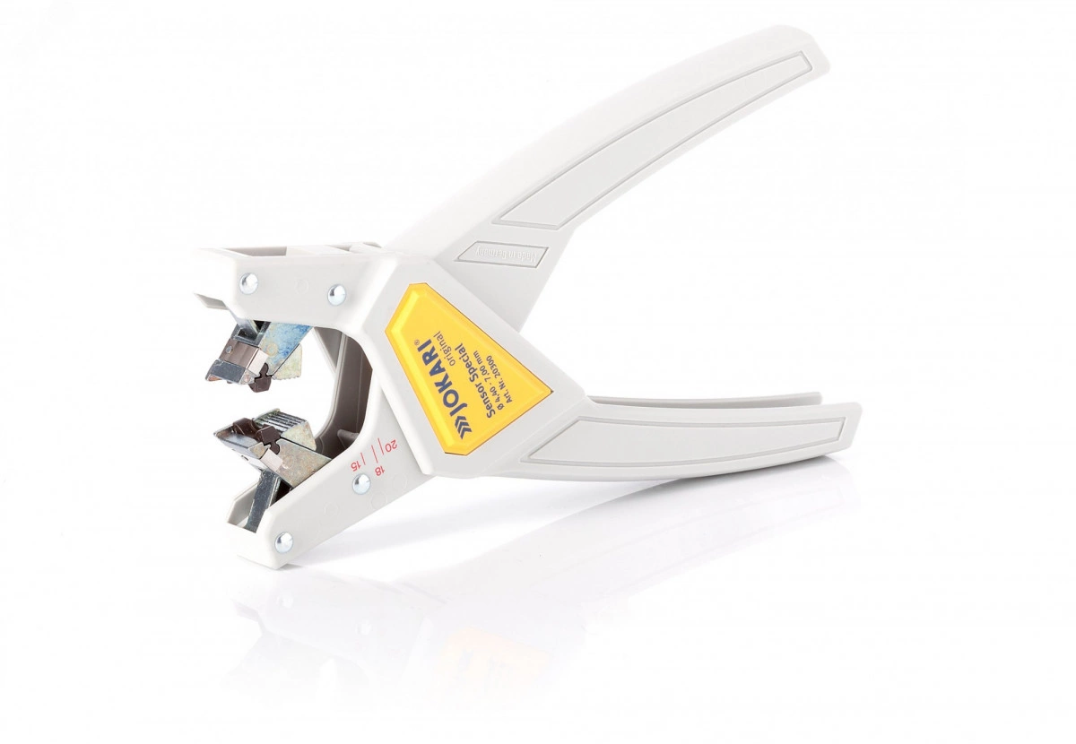 JOKARI - один из лидеров по производству инструмента для электромонтажных работ по снятию изоляции. Технологии подтвержденные множеством патентов позволяют изготавливать качественные стрипперы, ножи и автоматические съёмники изоляции. Инструменты фирмы JOKARI - 100% изготавливаются на собственных заводах в Германии как под своим именем, так и для многих других известных мировых брендов под их торговыми марками. Клещи для снятия изоляции JOKARI Sensor Special для усиленных сигнальных кабелей, артикул - 20300 Предназначен для снятия PUR-halogen-free-, TPE-U-, PUR/PVC-, PVC-изоляции многожильных, экранированных и неэкранированных кабелей.