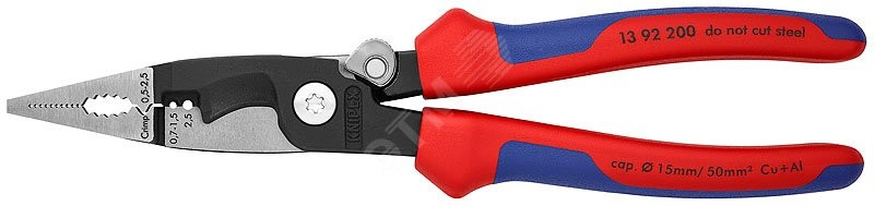 Электромонтажные клещи 6 функций в одних клещах. Mногофункциональные клещи для электромонтажных работ, для захвата плоского и круглого материала, гибки, удаления заусенцев, резки кабеля, удаления изоляции и опрессовки контактных гильз. гладкие губки для захвата отдельных жил без их повреждения, профилированные губки и выемка для захвата плоского и круглого материала. специальная наружная кромка на губке для обработки штепсельных розеток для скрытой проводки и удаления заусенцев на отверстиях для ввода кабеля. удаление изоляции с проводов 0,75 – 1,5 мм.кв и 2,5 мм.кв. опрессовочное гнездо для контактных гильз 0,5 – 2,5 мм.кв. ножницы с прецизионными лезвиями (индуктивной закалки) для резки медного и алюминиевого кабеля до 5 x 2,5 мм.кв / диаметр 15 мм. Узкая конструкция рабочей части облегчает доступ к детали