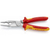 Электромонтажные клещи 6 функций в одних клещах. Mногофункциональные клещи для электромонтажных работ, для захвата плоского и круглого материала, гибки, удаления заусенцев, резки кабеля, удаления изоляции и опрессовки контактных гильз. гладкие губки для захвата отдельных жил без их повреждения, профилированные губки и выемка для захвата плоского и круглого материала. специальная наружная кромка на губке для обработки штепсельных розеток для скрытой проводки и удаления заусенцев на отверстиях для ввода кабеля. удаление изоляции с проводов 0,75 – 1,5 мм.кв и 2,5 мм.кв. опрессовочное гнездо для контактных гильз 0,5 – 2,5 мм.кв. ножницы с прецизионными лезвиями (индуктивной закалки) для резки медного и алюминиевого кабеля до 5 x 2,5 мм.кв / диаметр 15 мм. Узкая конструкция рабочей части облегчает доступ к детали