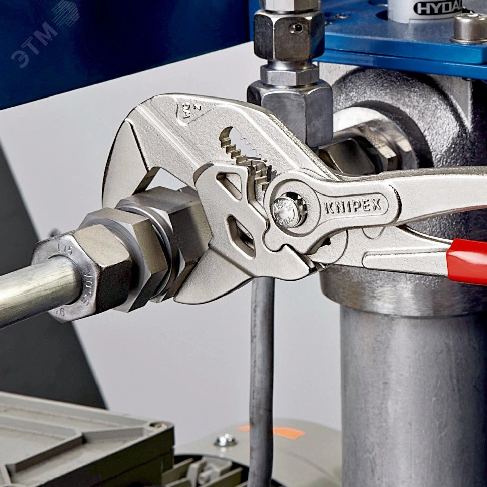 Клещи переставные-гаечный ключ Заменяют полный набор гаечных ключей, как метрических, так и дюймовых. Гладкие губки для бережного монтажа арматуры с высококачественной отделкой поверхностей - работа непосредственно с хромированными деталями. отлично подходят для захвата, фиксации, опрессовки и гибки деталей. при монтаже деталей с высококачественной отделкой они не повреждаются благодаря плотному прилеганию губок ключа по всей поверхности. регулировка прямо на детали простым нажатием кнопки. случайное изменение установки захватных губок и проскальзывание шарнира исключаются. бесступенчатая установка нужного размера ключа в рабочем диапазоне за счет параллельного хода губок. зазор между захватными плоскостями обеспечивает быстрое заворачивание и отворачивание винтовых соединений по принципу трещоточного ключа. 10-кратное увеличение передачи усилия