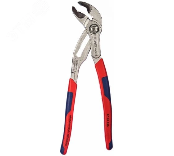 87 05 250 KNIPEX Cobra регулировка прямо на детали простым нажатием кнопки. настройка непосредственно на детали при одновременно удобном расположений ручек. функция смыкания губок, которая облегчает работу в узких и труднодоступных местах. захватные губки со специально закаленными зубцами твердостью примерно 61 HRC - надежный захват - надолго!. коробчатый шарнир - высокая стабильность благодаря двум направляющим. надежная фиксация винта шарнира - случайная перестановка исключена. Защита от защемления пальцев. с длинными ручками в двухцветных многокомпонентных чехлах без упоров - для большего удобства в использовании и более простой транспортировки. - Позиции установки - 25 - Диапазон для гаек, размер под ключ - 2 - Диапазон для гаек, размер под ключ - 46mm - Параметры для труб (диаметр) - 50mm