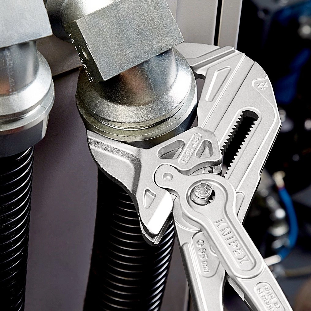 Клещи переставные-гаечный ключ единственный в своём роде монтажный инструмент теперь длиной 400 мм. Для размера ключа до 85 мм / 3 3/8. отлично подходят для захвата, фиксации, опрессовки и гибки деталей. оптимальный захват детали с удобным положением рукояток инструмента. надежная фиксация винта шарнира - случайная перестановка исключена. 10-кратное увеличение передачи усилия. регулируемый инструмент для работы с винтовыми соединениями. заменяет различные дорогостоящие гаечные ключи большого размера до 85 мм или 3 3/8. бесступенчатая установка нужного размера ключа в рабочем диапазоне за счет параллельного хода губок. гладкие губки, в т.ч. для бережного завинчивания высококачественных деталей из латуни, литейной оловяно-цинковой бронзы, нержавеющей стали. при монтаже деталей с высококачественной отделкой они не повреждаются благодаря плотному прилеганию губок ключа по всей поверхности