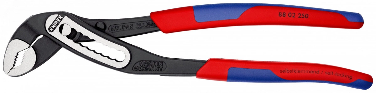 88 02 250 KNIPEX Alligator функция смыкания губок, которая облегчает работу в узких и труднодоступных местах. захватные губки со специально закаленными зубцами твердостью примерно 61 HRC - надежный захват - надолго!. коробчатый шарнир - высокая стабильность благодаря двум направляющим. Прочная конструкция, устойчивы к загрязнениям, особенно подходят для работ вне помещения. Защита от защемления пальцев. с длинными ручками в двухцветных многокомпонентных чехлах без упоров - для большего удобства в использовании и более простой транспортировки. - Позиции установки - 9 - параметры для труб дюймы (диаметр) - 2 in - Диапазон для гаек, размер под ключ - 46mm - Параметры для труб (диаметр) - 50mm