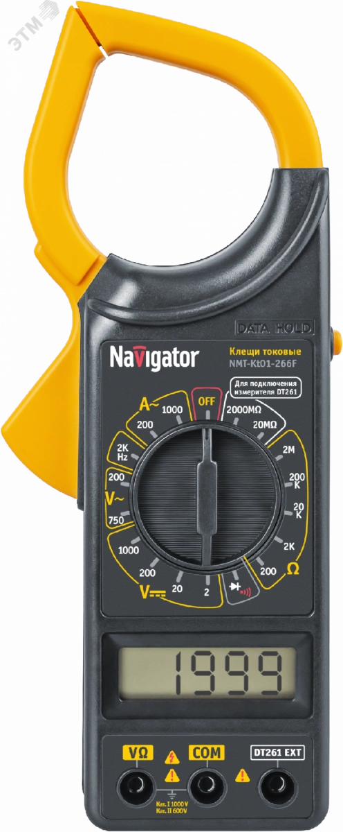Токовые клещи Navigator серии NMT-Kt01 используются для проведения измерений электротехнических параметров сети и приборов при электромонтажных работах в быту и на производстве. Клещи-трансформатор позволяют быстро и точно измерять переменный ток без разрыва самой цепи, в которой проводится измерение. 3,5 разрядный ЖК-дисплей с автоопределением полярности, максимальное показание дисплея 1999. Надежный многопозиционный переключатель режимов работы и пределов измерений. Оптимальная скорость- 2–3 измерения в секунду. Автоматическая индикация перегрузки. Индикатор низкого заряда батареи. Фиксация последних результатов HOLD. Тканевая сумка для удобного хранения и переноски. Батарея в комплекте. Диапазон рабочих температур 0…+40 °С.