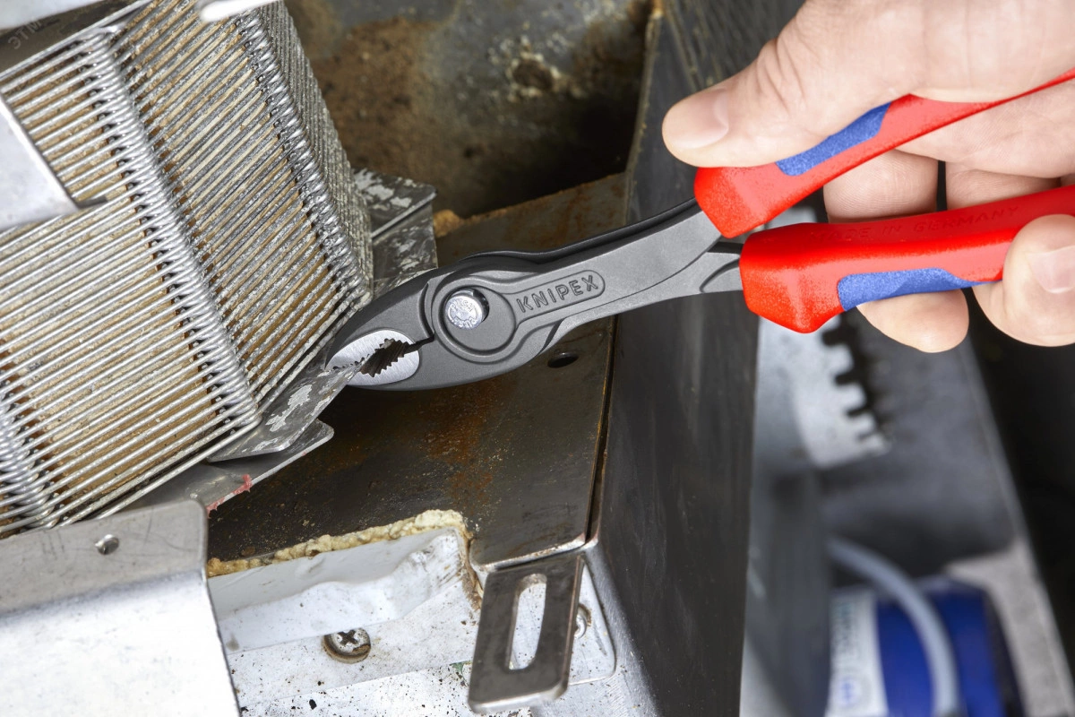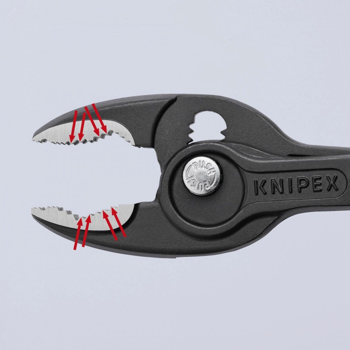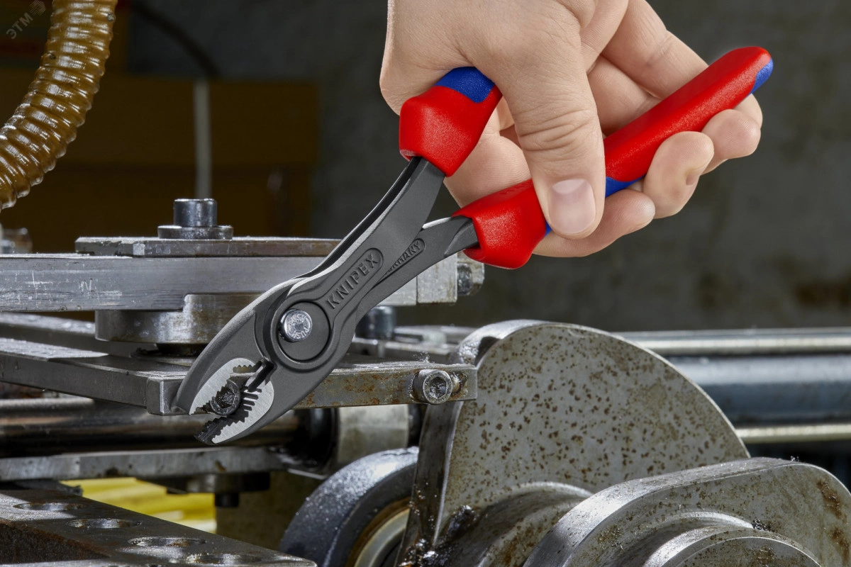 TwinGrip Уникальная комбинация - функция переднего и бокового захвата, коробчатый шарнир, Кнопочная. Очень тонкие клещи позволяют работать даже в ограниченном монтажном пространстве с узкой зоной разворота для достижения быстрых результатов. Передняя сторона губок с мощным захватом, прочными зубьями и высоким коэффициентом сцепления на верхушке губок. Широкий диапазон переднего и бокового захвата 4 - 22 мм. Надёжный передний захват деталей с помощью трехточечной системы. Захват, затяжка и откручивание винтов с изношенными головками и резьбами. Скользящий шарнир с пятиступенчатой регулировкой и с кнопочной регулировкой для точной регулировки емкости захвата. Ограничитель защемления снижает риск защемления пальцев. Долговечность и устойчивость благодаря прочному коробочному шарниру
