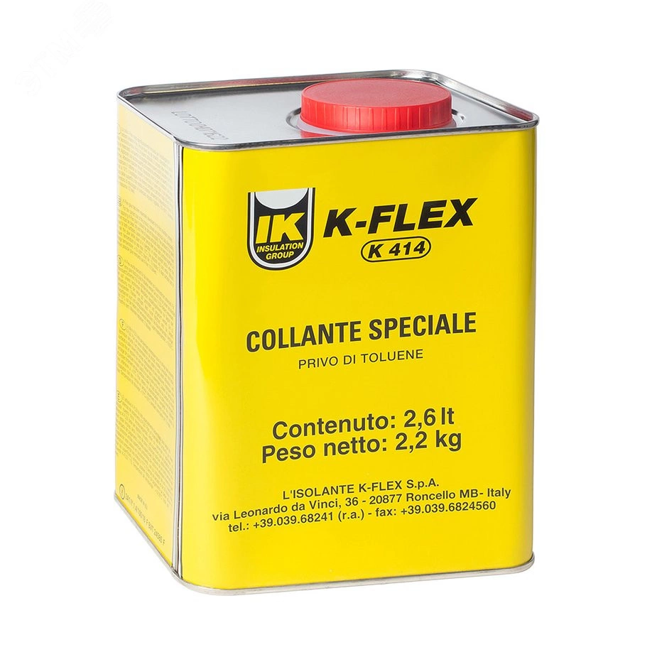 Клей K-Flex K-414 — монокомпонентный клеевой состав с основой из полихлоропренового каучука. Применяется для склеивания теплоизоляционных деталей и материалов - AIR, IGO, ECO, ST. Части теплоизоляции имеют разнообразные покрытия IC CLAD SR, AL CLAD, IC CLAD BK и IN CLAD. Для клеевых монтажных работ подходящая температура — от +9 до +28 градусов. Попадание ультрафиолетовых лучей на клеевой состав не желательно. Хранение и транспортирование клея возможно даже при отрицательных температурных показателях. Клей сохраняет свои свойства даже при заморозке. При оттаивании он также может быть применен по назначению. Разморозка должна происходить при закрытой крышке.