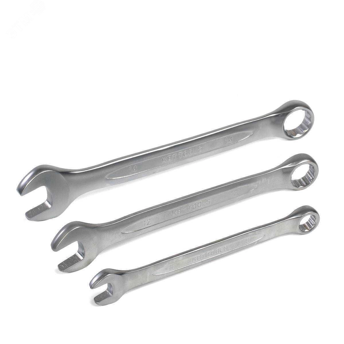 Ключи гаечные комбинированные предназначены для монтажа резьбовых соединений при проведении слесарно-монтажных, авторемонтных, сантехнических работ. Размеры ключей - 6, 7, 8, 9, 10, 11, 12, 13, 14, 15, 16, 17, 18, 19, 22. Материал ключей - хром-ванадиевая сталь. Покрытие - матовое никелирование. Твердость - HRC 42-48