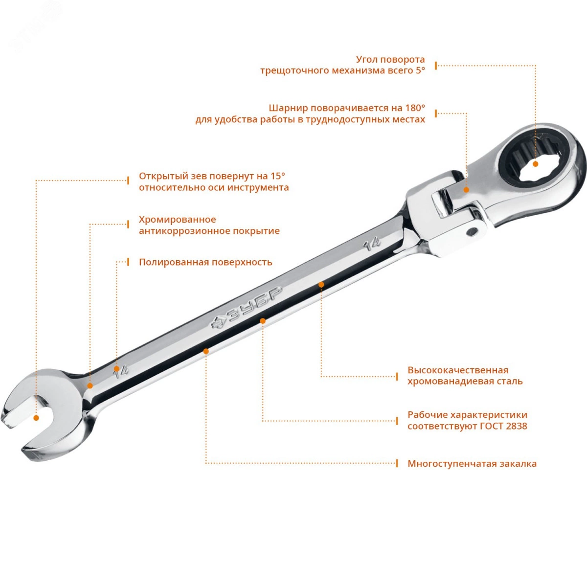 Полное описание: Ключ гаечный комбинированный трещоточный шарнирный 14 мм