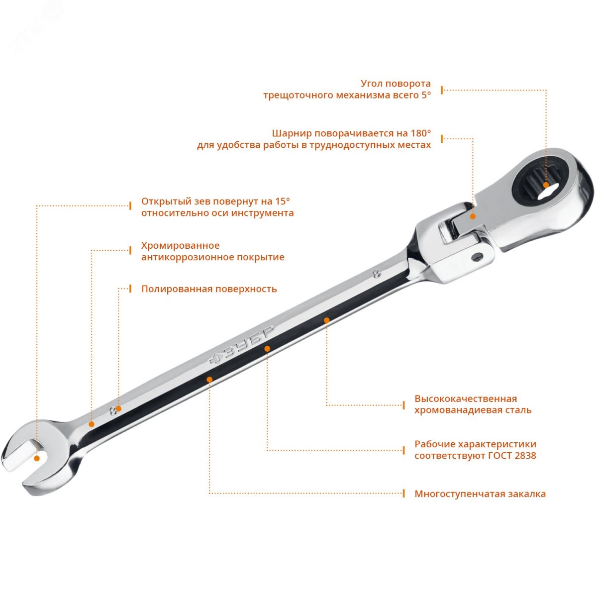 Полное описание: Ключ гаечный комбинированный трещоточный шарнирный 8 мм
