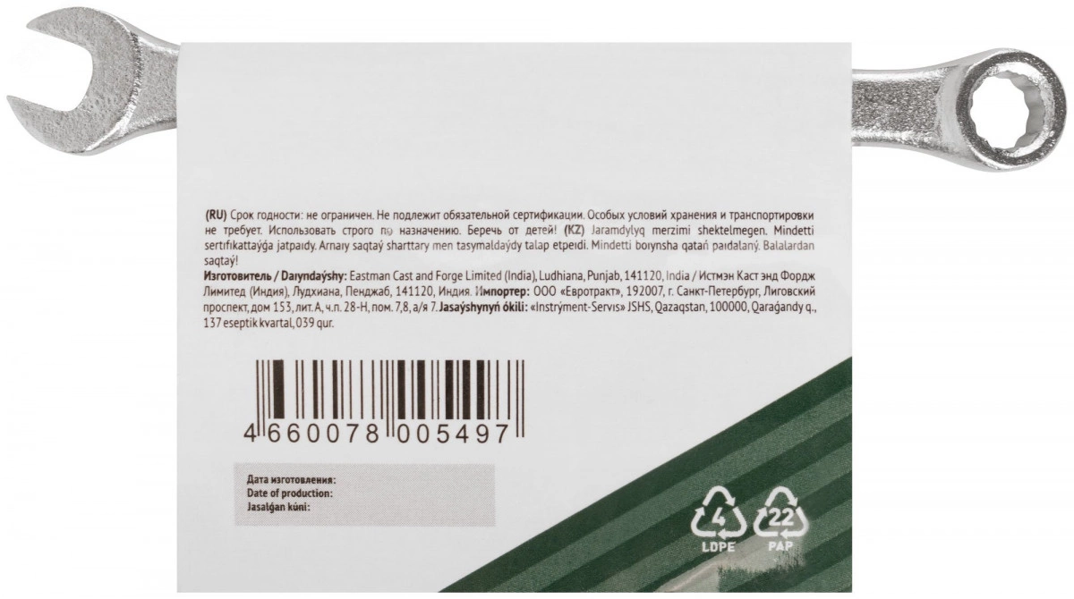 Ключ проходит процесс закалки, повышающей твердость и износостойкость|Наклон рожковой части 15 градусов повышает эффективность работы|Рожковая часть эффективна при работе в труднодоступных местах|Накидная часть ключа выдерживает максимальные нагрузки