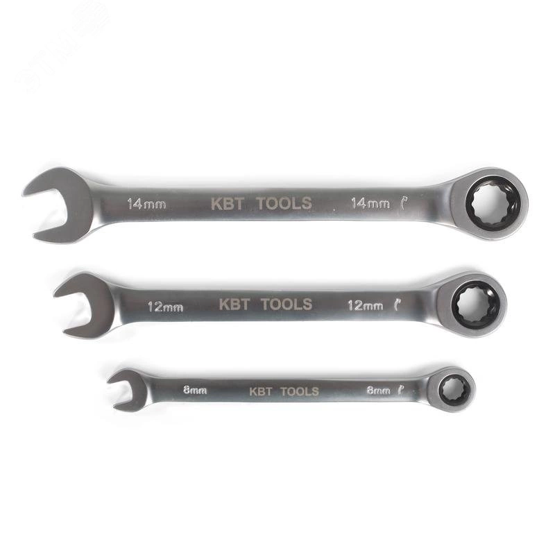 Набор комбинированных трещоточных ключей предназначен для монтажа резьбовых соединений при проведении слесарно-монтажных, авторемонтных, сантехнических работ. Трещоточный механизм накидной части ключа, позволяет комфортно работать в местах с ограниченным пространством. Размеры ключей - 8, 10, 12, 13, 14, 15, 17, 19 мм. Количество зубцов трещотки - 72. Минимальный угол поворота кольцевой трещоточной части - 5 градусов. Материал ключей - хром-ванадиевая сталь. Покрытие - матовое никелирование. Твердость - HRC 42-48. Упаковка - пластиковый холдер