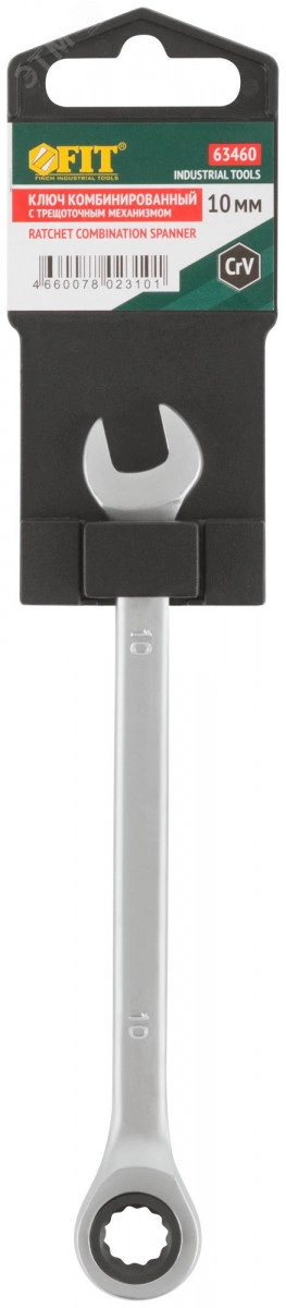 Ключ комбинированный трещоточный FIT IT предназначен для работ с крепежными элементами. Трещоточный механизм ускоряет процесс затягивания болтов. 72 зубца обеспечивают плавный и мягкий ход механизма. 12-гранный профиль накидной части обеспечивает надежный захват крепежных элементов и снижает риск их деформации. Корпус ключа изготовлен из термообработанной легированной стали, а зубья трещотки выполнены из хромованадиевого сплава. От ржавчины инструмент защищает хромированное покрытие.