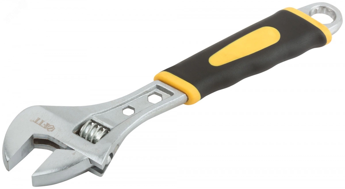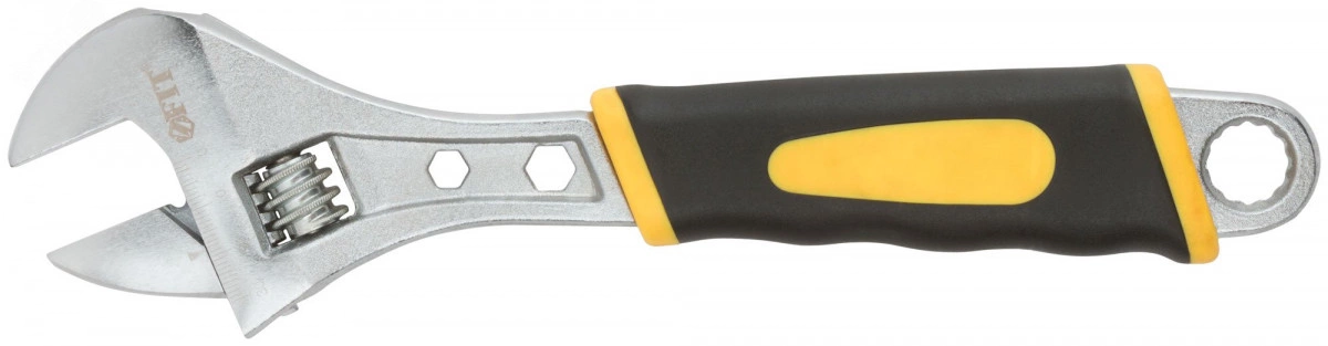 Ключ разводной ''Старт'' FIT IT — универсальный инструмент для сантехнических и слесарных работ, заменяющий целый набор обычных рожковых ключей! Ключ изготовлен из штампованной термообработанной инструментальной стали с хромированным покрытием. Накидной ключ, встроенный в рукоятку, делает данное изделие многофункциональным. Удобная эргономичная рукоятка с ПВХ-накладкой не скользит в руке во время работы. Размерная шкала позволяет точно настроить ключ.