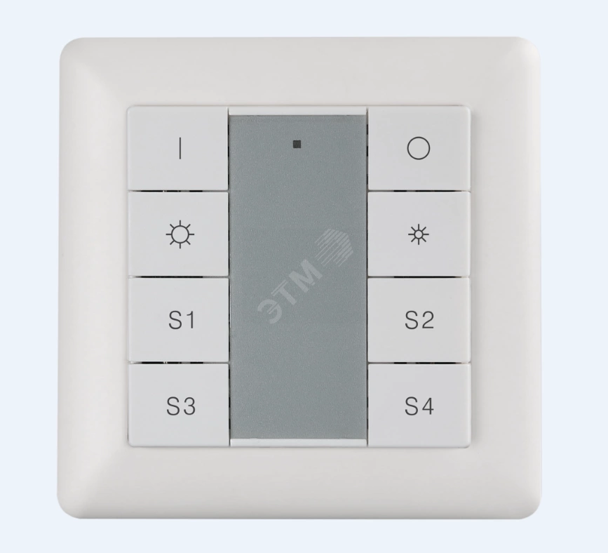 Накладная пластиковая панель белого цвета с кнопочным управлением DALI (4 кнопки управления). Управление 1 группой и 4 сценами DALI. Кнопками выполняется включение сцен в соответствующей группе. Выбор управляемой группы осуществляется вручную с помощью поворотного переключателя на задней панели. Питание по шине DALI 4мА. Простая установка, рамки панели совместимы со стандартными рамками различный производителей - BEKER - S1, B1, B3, B7 glass. GIRA - Standard55, E2, Event, Esprit. JUNG - A500, Aplus. MERTEN - M-smart, M-Arc, M-Plan.