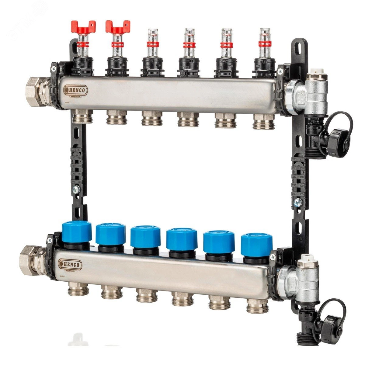 Коллектор из нержавеющей стали, регулируемый расходомер, воздухоотводчик, дренаж и клапан заполнения, 1” - 7 x 3/4”