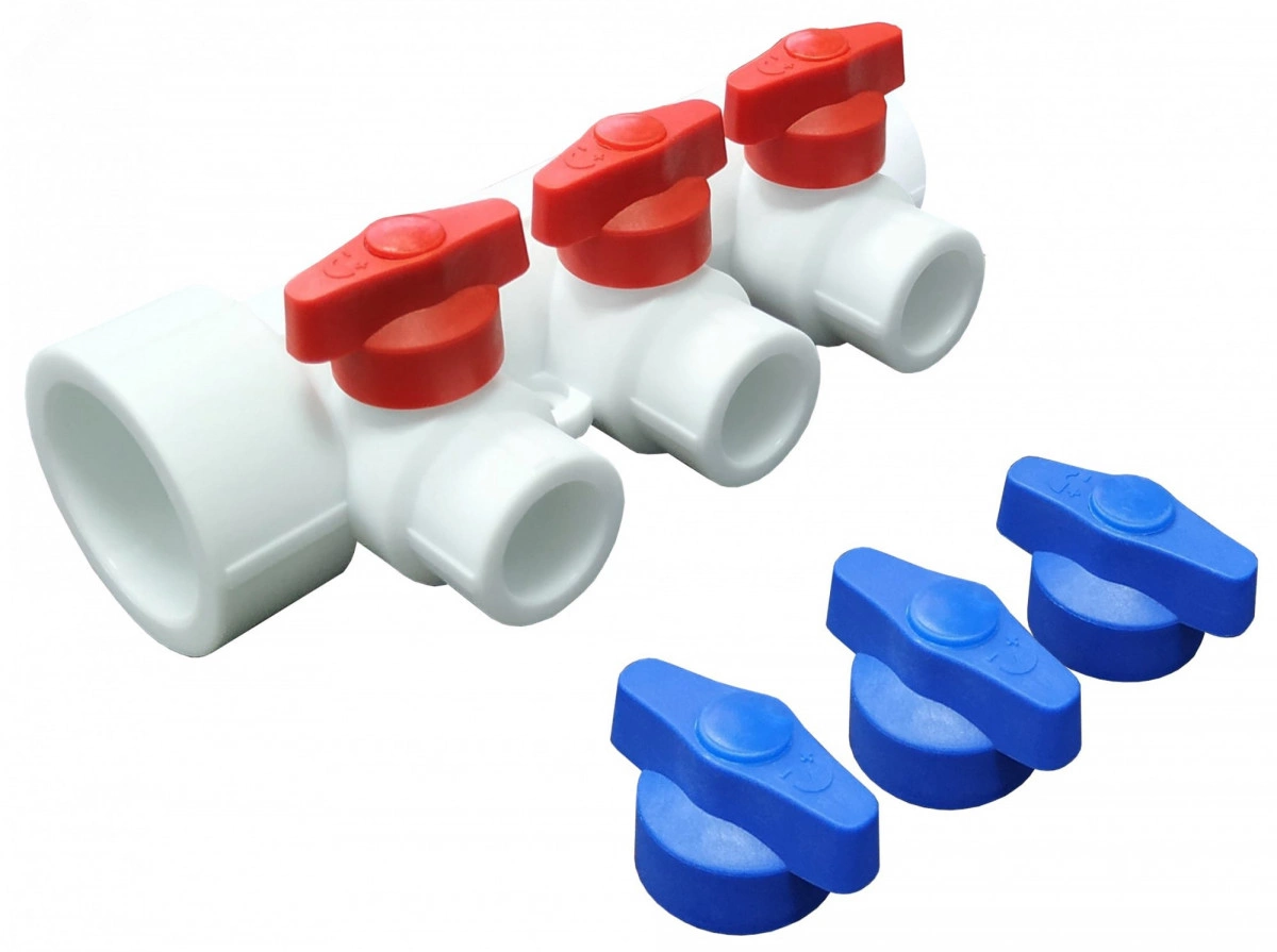 Коллектор PPR с отсечными кранами 40х20, 3 выхода универсальный, белый