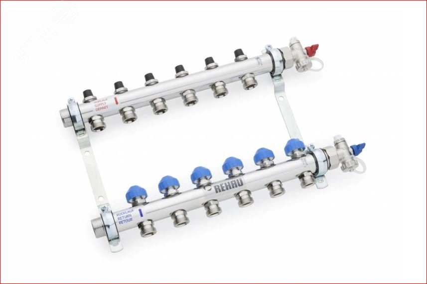 Распределительный коллектор REHAU HKV Включает в себя - 2 распределительные трубы 1 дюйм для подачи и отвода теплоносителя с возможностью подключения с обеих сторон. Смонтирован на звукоизолирующих оцинкованных кронштейнах соответствующих требованиям DIN 4109. Преимущества - возможность подключения с любой стороны распределительного коллектора, удобство монтажа благодаря смещенному положению сборного с распределительного коллекторов друг относительно друга, предварительно смонтирован на кронштейнах со звукоизоляционными вставками.