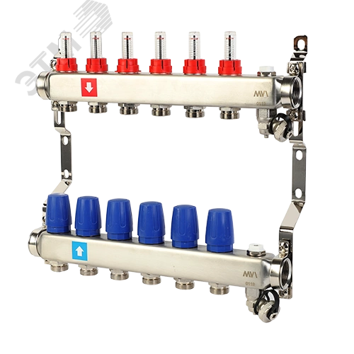 Коллекторные блоки MVI предназначены для распределения потока рабочей среды систем водяного отопления по потребителям. При этом под 'потребителем' понимается отдельный нагревательный прибор или группа приборов, контур или петля 'теплого пола', отдельные части или ветви системы. Коллекторный блок объединяет в себе подающий и обратный коллекторы из нержавеющей стали, ручные настроечные клапаны c расходомерами, термостатические клапаны (с возможностью установки электротермического сервопривода) и крепежные кронштейны. Коллекторные блоки выпускаются с количеством выходов от 2 до 12.