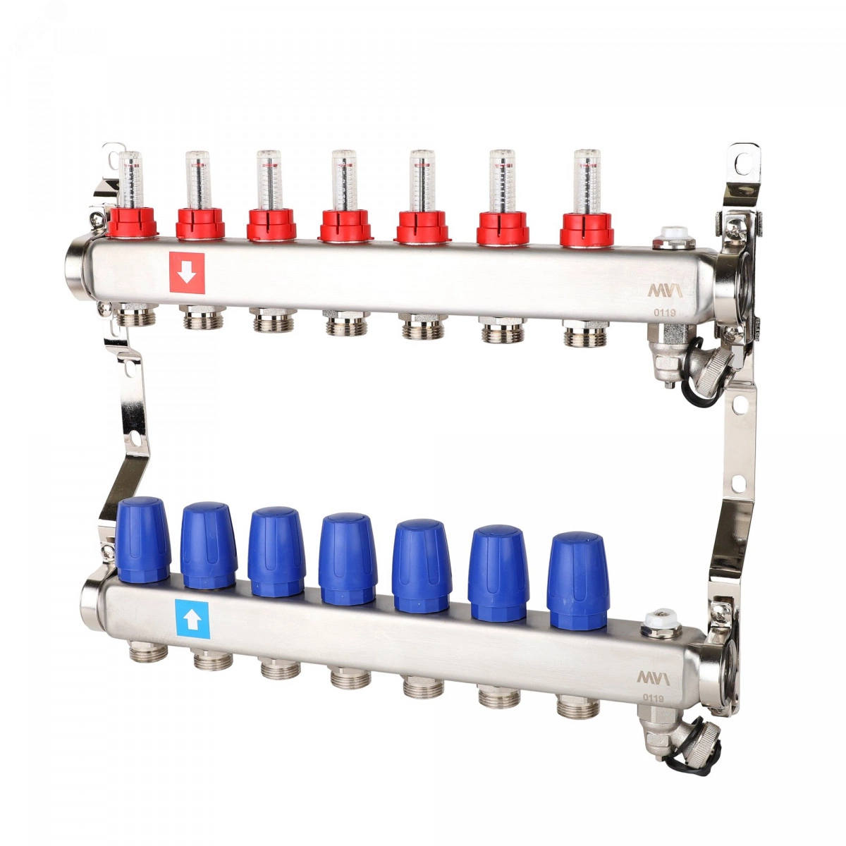 Коллекторная группа с расходомерами 1' х 7 выходов 3/4' НР евроконус с дренажным краном и воздухоотводчиком
