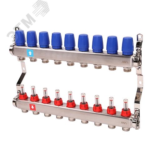 Коллекторные блоки предназначены для распределения потока рабочей среды систем водяного отопления по потребителям. При этом под 'потребителем' понимается отдельный нагревательный прибор или группа приборов, контур или петля 'теплого пола', отдельные части или ветви системы. Коллекторный блок объединяет в себе подающий и обратный коллекторы из нержавеющей стали, ручные настроечные клапаны c расходомерами, термостатические клапаны (с возможностью установки электротермического сервопривода) и крепежные кронштейны. Коллекторные блоки могут работать как на водяном, так и низкозамерзающем (гликолевом) теплоносителе. Коллекторные блоки выпускаются с количеством выходов от 2 до 12.