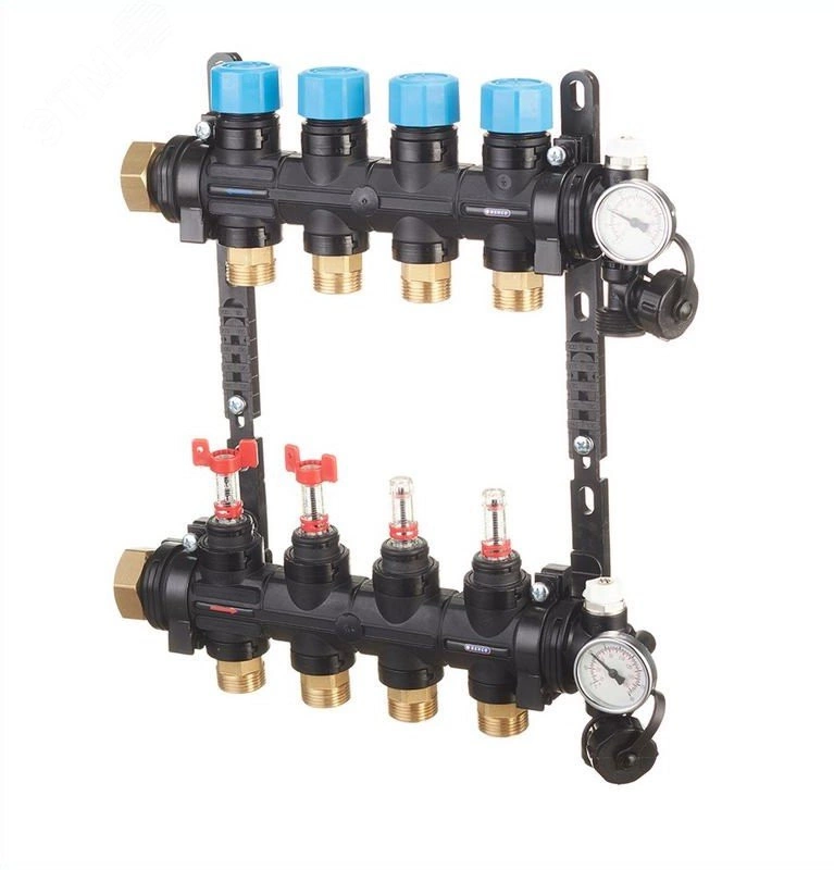 Коллекторная группа с расходомером 1' х 4 выхода 3/4' НР евроконус, с термометром