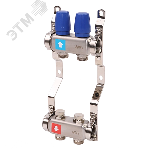 Коллекторные блоки предназначены для распределения потока рабочей среды систем водяного отопления по потребителям. При этом под 'потребителем' понимается отдельный нагревательный прибор или группа приборов, контур или петля 'теплого пола', отдельные части или ветви системы. Коллекторный блок объединяет в себе подающий и обратный коллекторы из нержавеющей стали, ручные настроечные клапаны c расходомерами, термостатические клапаны (с возможностью установки электротермического сервопривода) и крепежные кронштейны. Коллекторные блоки могут работать как на водяном, так и низкозамерзающем (гликолевом) теплоносителе. Коллекторные блоки выпускаются с количеством выходов от 2 до 12.