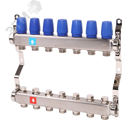 Коллекторные блоки предназначены для распределения потока рабочей среды систем водяного отопления по потребителям. При этом под 'потребителем' понимается отдельный нагревательный прибор или группа приборов, контур или петля 'теплого пола', отдельные части или ветви системы. Коллекторный блок объединяет в себе подающий и обратный коллекторы из нержавеющей стали, ручные настроечные клапаны c расходомерами, термостатические клапаны (с возможностью установки электротермического сервопривода) и крепежные кронштейны. Коллекторные блоки могут работать как на водяном, так и низкозамерзающем (гликолевом) теплоносителе. Коллекторные блоки выпускаются с количеством выходов от 2 до 12.