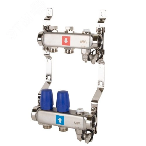 Коллекторная группа с ручными регулировочными клапанами 1' х 2 выхода 3/4' НР евроконус с дренажным краном и воздухоотводчиком
