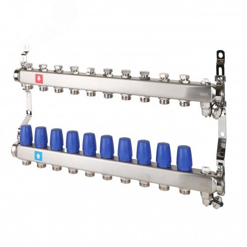 Коллекторные блоки предназначены для распределения потока рабочей среды систем водяного отопления по потребителям. При этом под 'потребителем' понимается отдельный нагревательный прибор или группа приборов, контур или петля 'теплого пола', отдельные части или ветви системы. Коллекторный блок объединяет в себе подающий и обратный коллекторы из нержавеющей стали, ручные настроечные клапаны c расходомерами, термостатические клапаны (с возможностью установки электротермического сервопривода) и крепежные кронштейны. Коллекторные блоки могут работать как на водяном, так и низкозамерзающем (гликолевом) теплоносителе. Коллекторные блоки выпускаются с количеством выходов от 2 до 12.