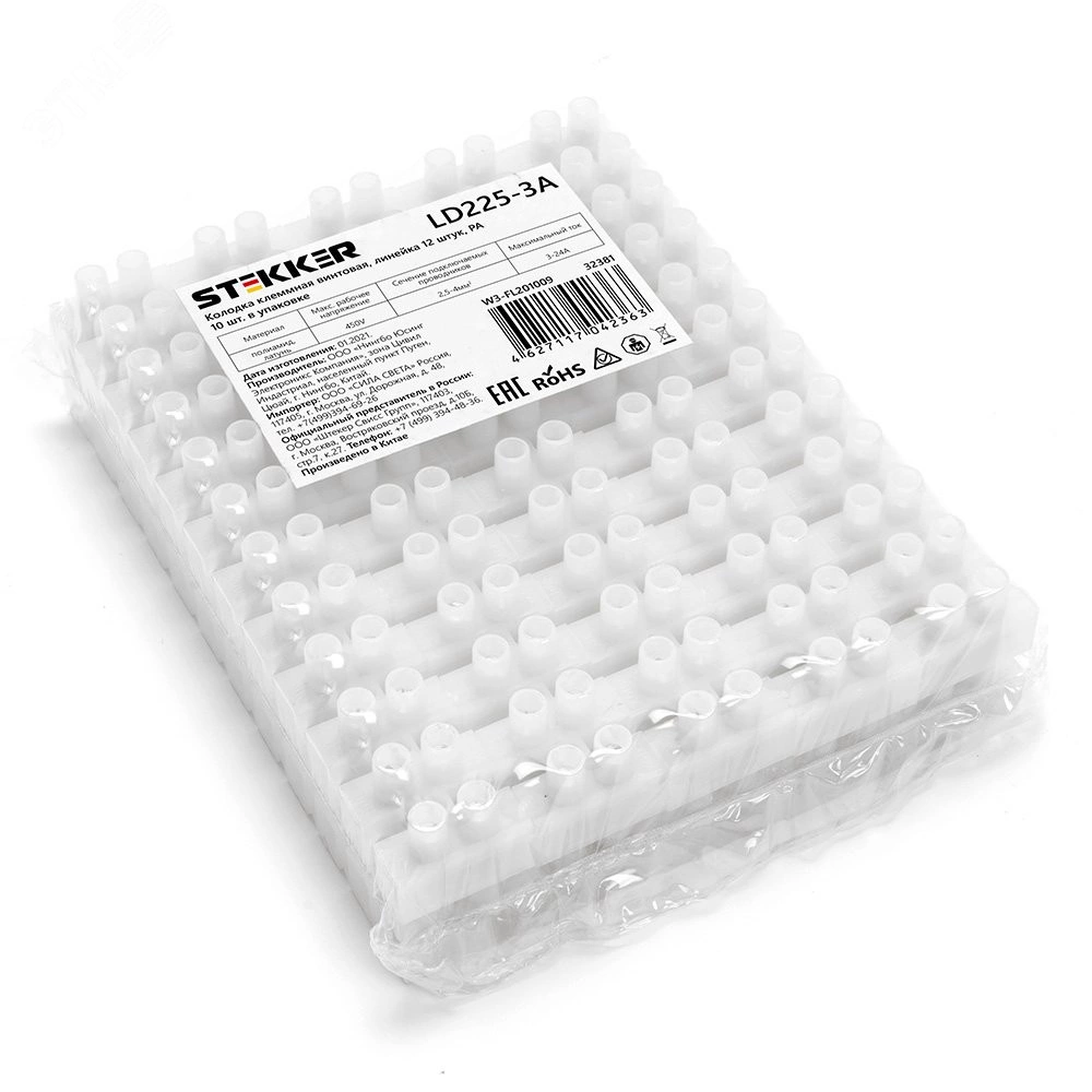 Зажим винтовой изолированный или клеммная винтовая колодка STEKKER LD225-3A, 12-проводная, сечение жилы 1,5-4мм2, 450В, 3А, без пасты, материал изделия полиамид, латунная токоведущая шина, стальной винт. Подходит для нескольких типов проводов одножильного или обжатого многожильного, материал проводника - медь, температура окружающей среды -25...+125 градусов Цельсия. Изоляционный каркас изготовлен из негорючего материала. Выполняет 2 задачи - защита провода от повреждения и исключение возможности замыкания на корпус электроустановки, является экономичным решением