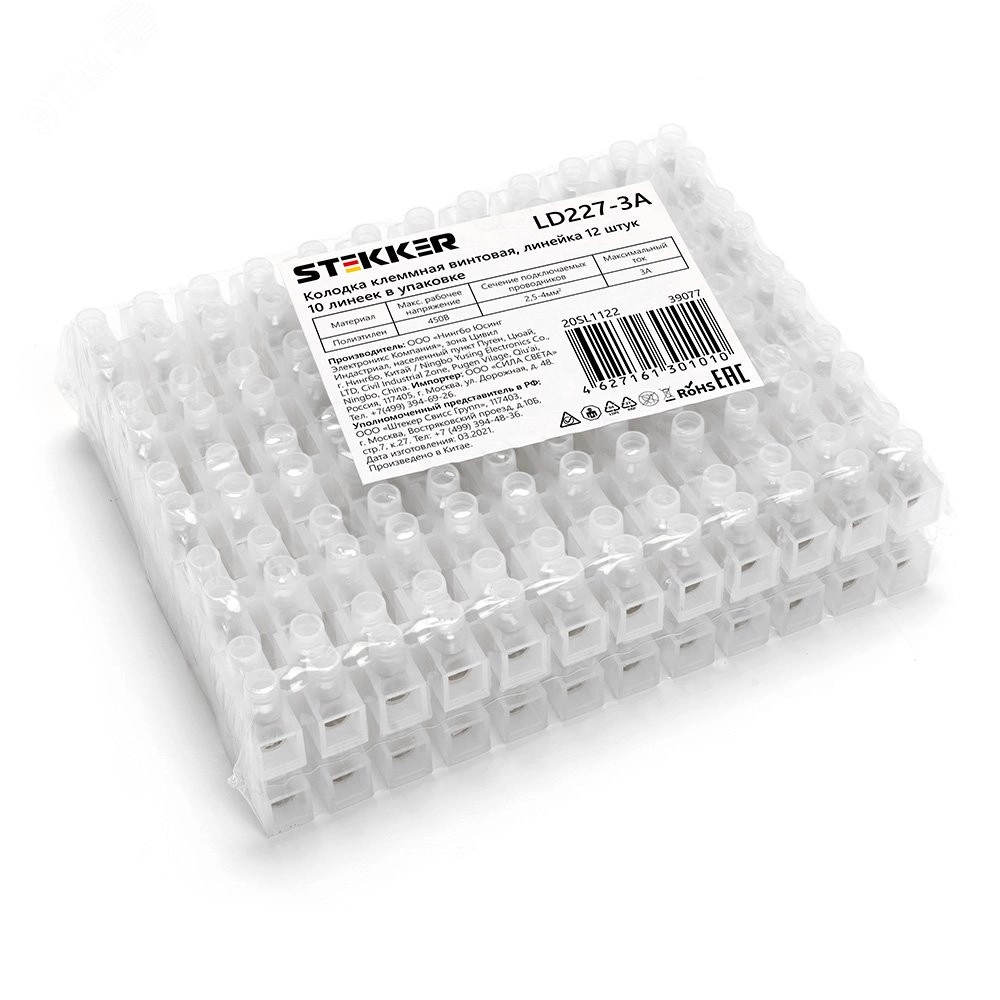 Зажим винтовой изолированный или клеммная винтовая колодка STEKKER LD227-3A,12-проводная, сечение жилы 1,5-4 мм2, 450В, 3А, без пасты, материал изделия полиэтилен, латунная токоведущая шина, стальной винт. Подходит для нескольких типов проводов одножильного или обжатого многожильного, материал проводника - медь, температура окружающей среды -25...+80 градусов Цельсия. Изоляционный каркас изготовлен из негорючего материала. Выполняет 2 задачи - защита провода от повреждения и исключение возможности замыкания на корпус электроустановки, является экономичным решением.