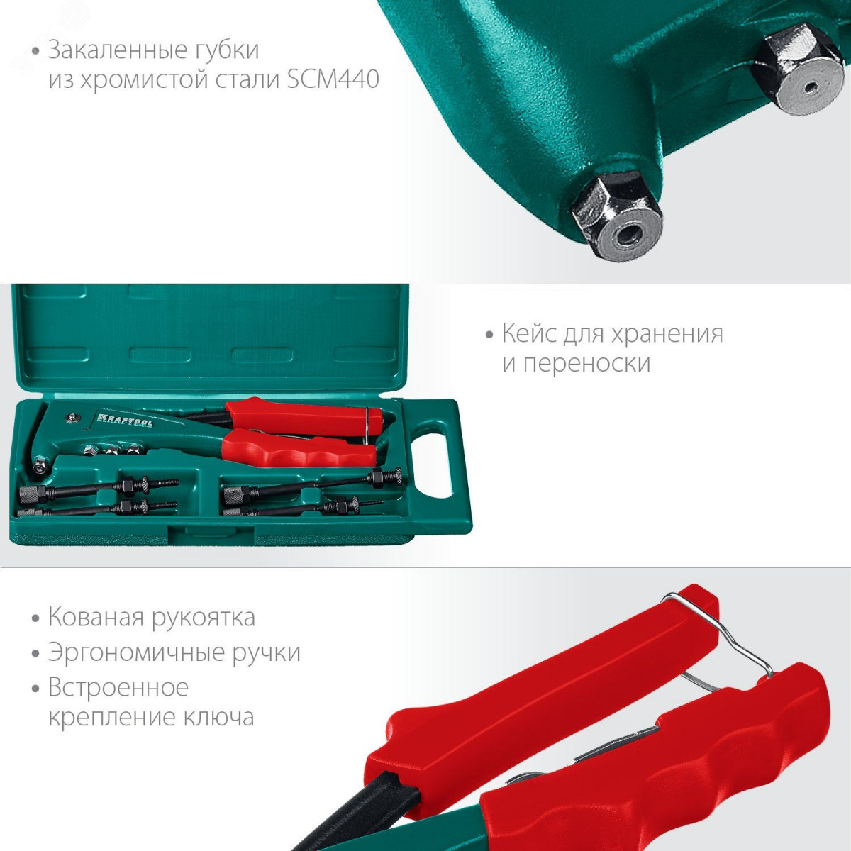 Комбинированный заклепочник работает с двумя видами заклепок вытяжными и резьбовыми|Повышенная прочность благодаря кованым рукояткам|Корпус изготовлен из специального сплава методом литья под давлением