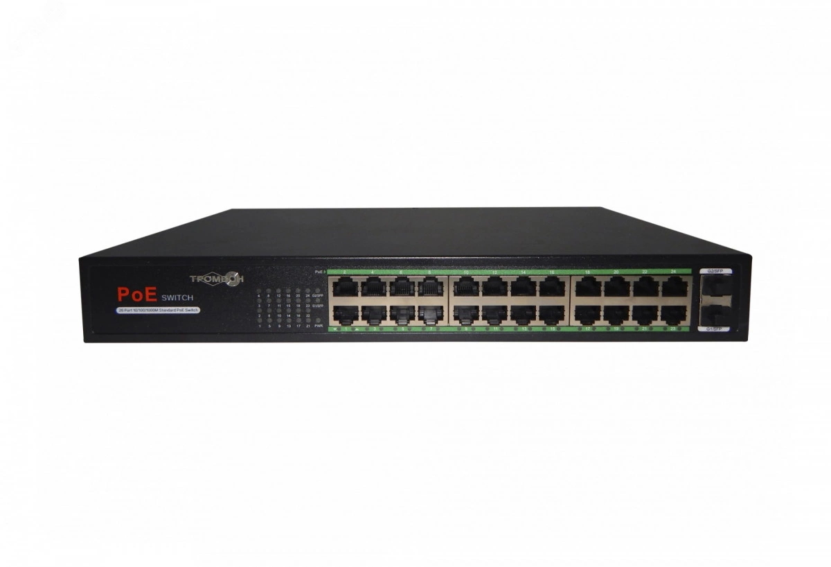 Предназначен для коммутации IP-устройств по проводной сети. Коммутатор оснащен двадцатью четырьмя LAN-портами с поддержкой питания РоЕ-устройств до 30Вт на порт и двумя оптическими SFP-портами. Суммарное PoE питание до 250Вт. Исполнение в металлическом корпусе классом защиты IP20 с комплектом крепления в 19'' стойку или шкаф. Питание от сети 220В.